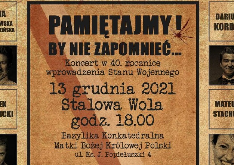 13 grudnia koncertem w Stalowej Woli uczczona zostanie 40. rocznica wprowadzenia stanu wojennego. Tego dnia znani artyści polskiej sceny muzycznej o godzinie 18:00 w bazylice konkatedralnej wyśpiewają pieśni, które były inspiracją do walki z totalitarnym systemem.